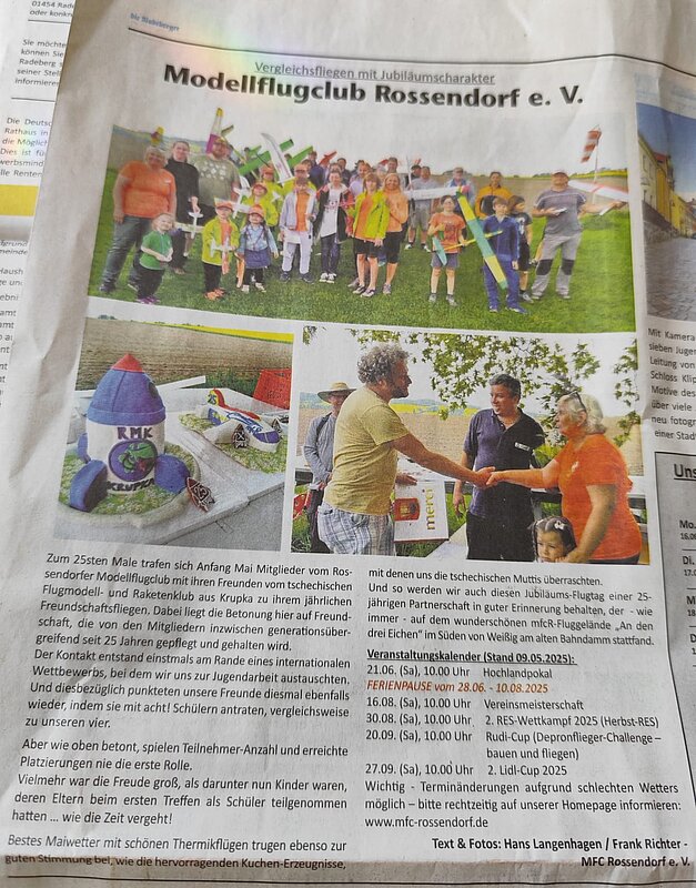 Ein besonderes Highlight im Vereinsjahr 2025 war das internationale Vergleichsfliegen des Modellflugclub Rossendorf e.V., über das ebenfalls die Zeitung Die Radeberger berichtete. Das Treffen hatte einen ganz besonderen Anlass: Bereits zum 25. Mal kamen Mitglieder des MFC Rossendorf mit ihren tschechischen Modellflugfreunden zusammen.