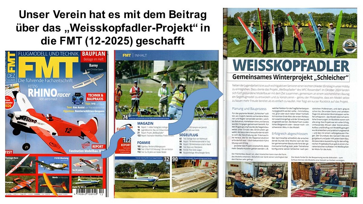 Der Modellflugclub Rossendorf e.V. ist in der führenden deutschen Fachzeitschrift für Flugmodellbau, FMT – Flugmodell und Technik, mit einem eigenen **Report über das „Weisskopfadler“-Projekt vertreten.